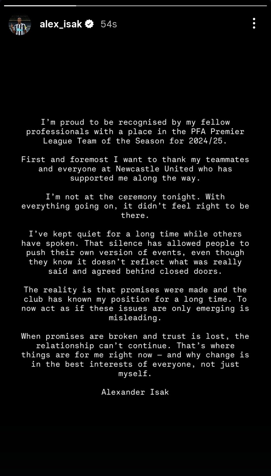 Yesterday, Isak’s Instagram story revealed his frustrations. He claimed that broken promises from Newcastle had led to a complete breakdown in trust. His stellar 2024–25 season, where he scored 27 goals across competitions, should have been a cause for celebration, but instead has ended in controversy.